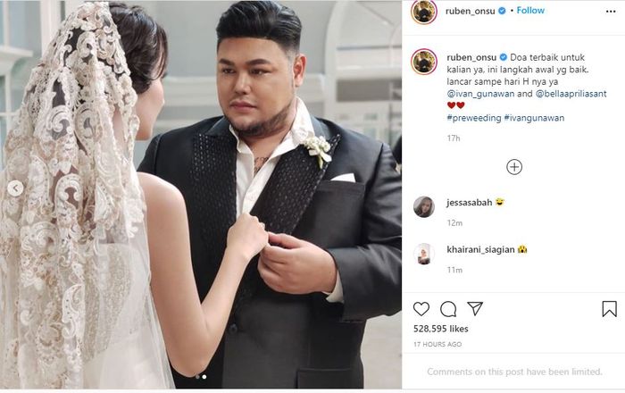 Lancar sampe hari H nya ya ivan_gunawan and bellaapriliasant tulis Ruben dalam foto prewedding Ivan Gunawan dan Bella Aprilia yang diunggahnya. Hal itu diketahui Tribunnews dari unggahan foto Ruben Onsu dalam akun Instagram pribadinya ruben_onsu Kamis 29102020. Total ada dua foto Igun dan Bella Aprilia yang terlihat di unggahan presenter tersebut.